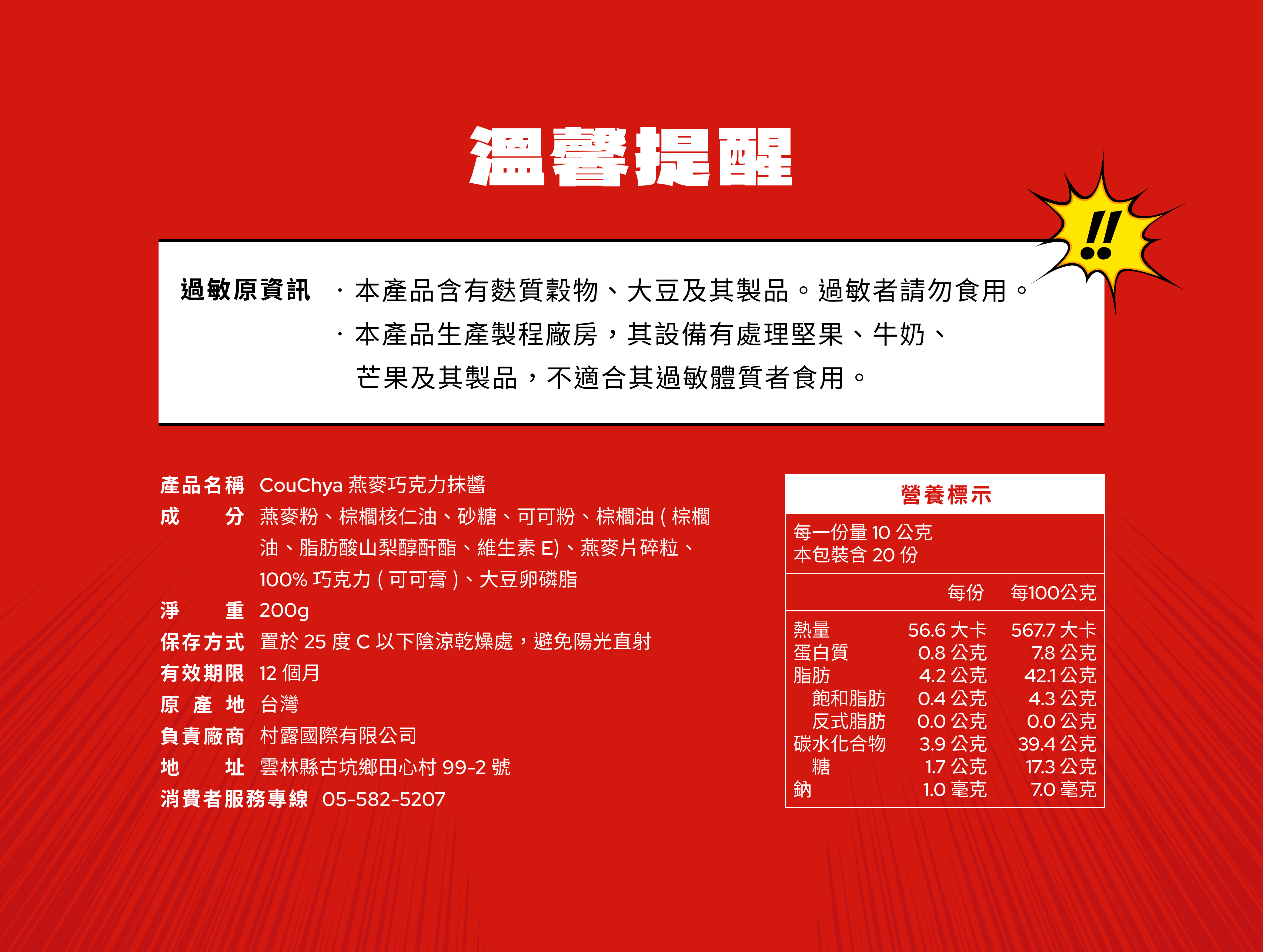 過敏原資訊:本產品含有麩質穀物、大豆及其製品,過敏者請勿食用。