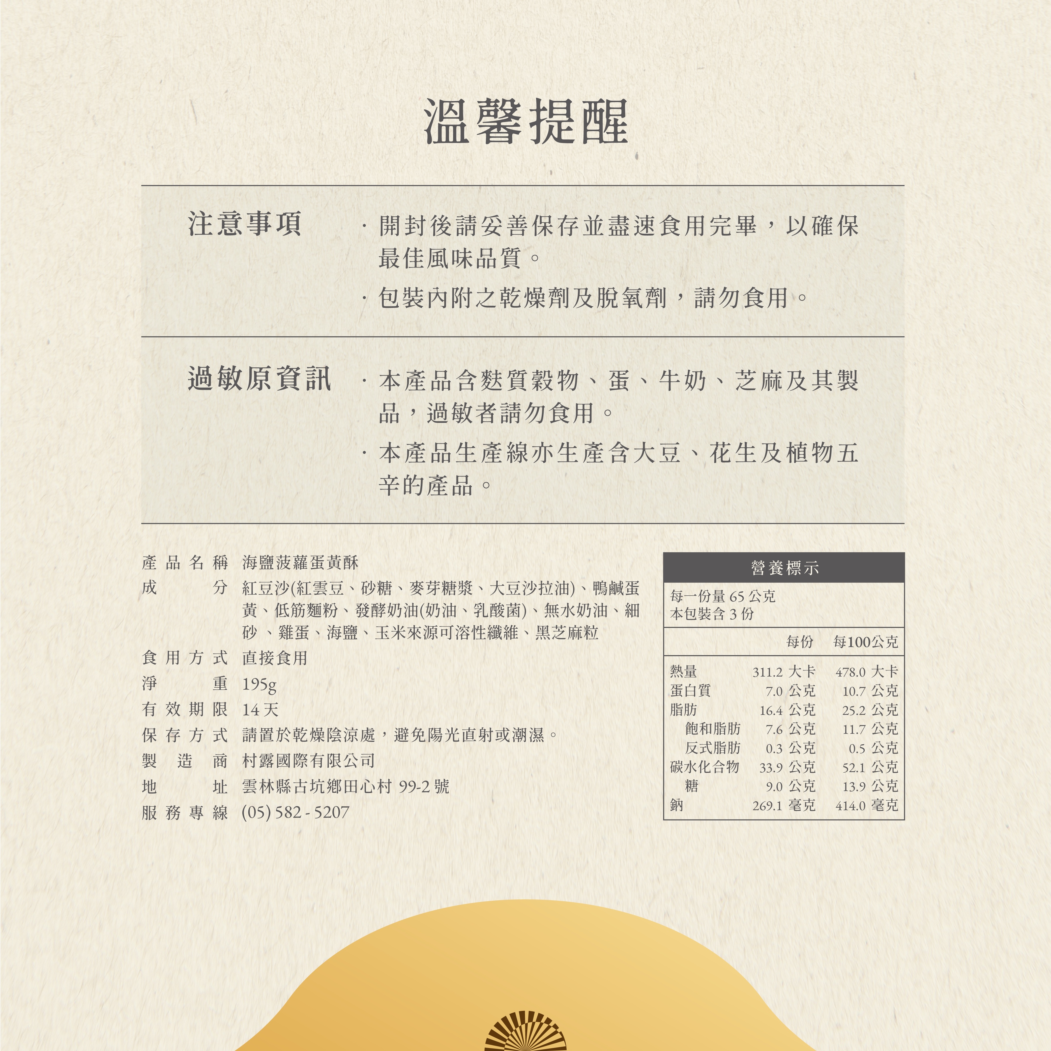•本產品含麩質穀物、蛋、牛奶、芝麻及其製品,過敏者請勿食用。