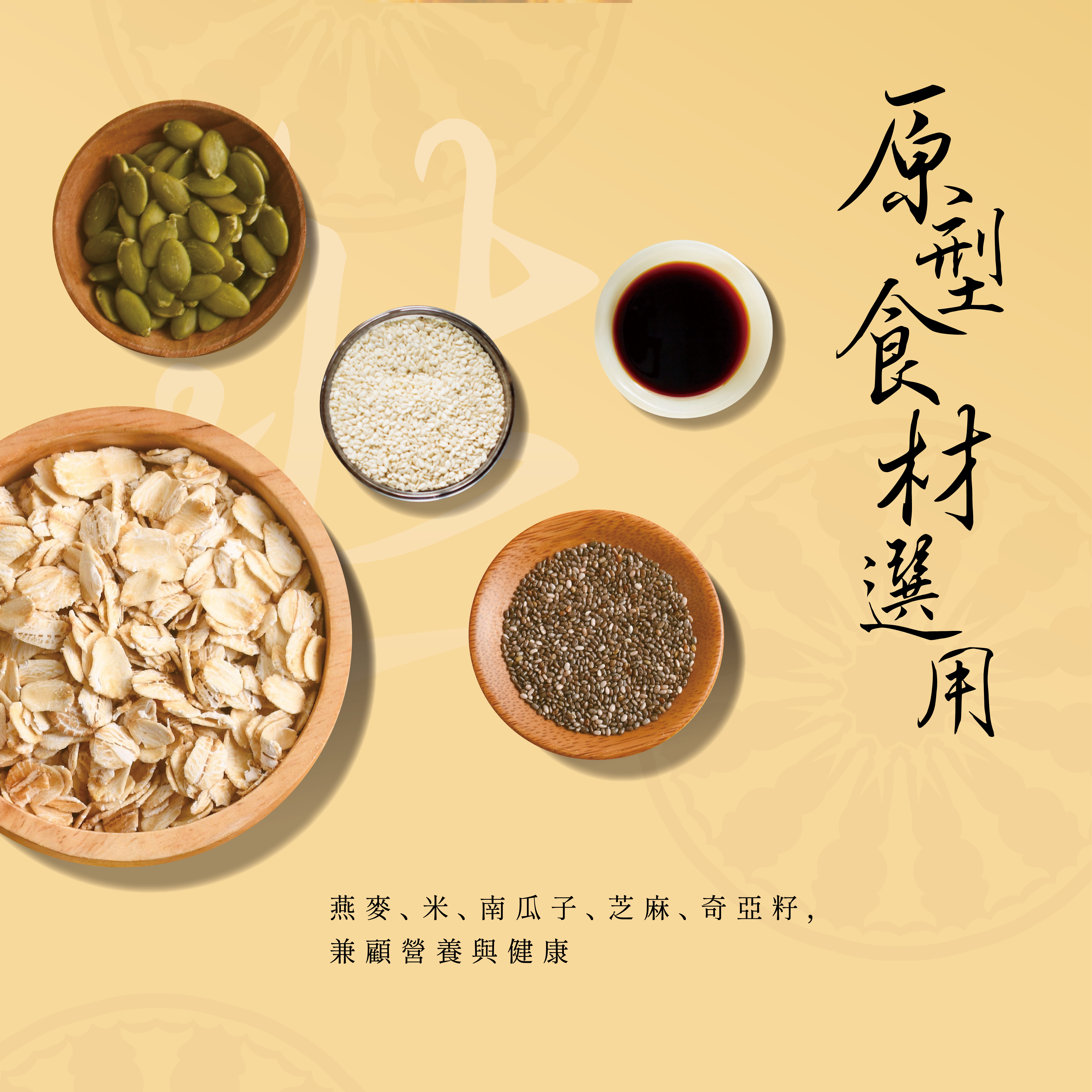 嚴選大燕麥片、芥花油、麥芽糖(麥芽糖、水)、糖、穀物粉(小麥、燕麥、大麥、紅扁豆、黑糯米、小米、蕎麥、油綠豆、黃豆、青仁黑豆)、優質米、亞麻仁籽、南瓜子、核桃、屏大薄鹽醬油膏(醬汁(水、黃豆(非基因改造)、小麥、食鹽)、水、砂糖、玉米澱粉)、白芝麻、屏大薄鹽醬油(醬汁(水、黃豆(非基因改造)、小麥、食鹽)、水、黑豆、小麥、食鹽、砂糖)、海鹽(非含碘)、雙效分解酵素(異麥芽糊精、澱粉酵素(麥芽糊精、酵素製劑(澱粉酵素)、糊精)、解脂酵素(麥芽糊精、糊精、酵素製劑(解脂酵素))、木寡糖)、混合濃縮生育醇(抗氧化劑)。