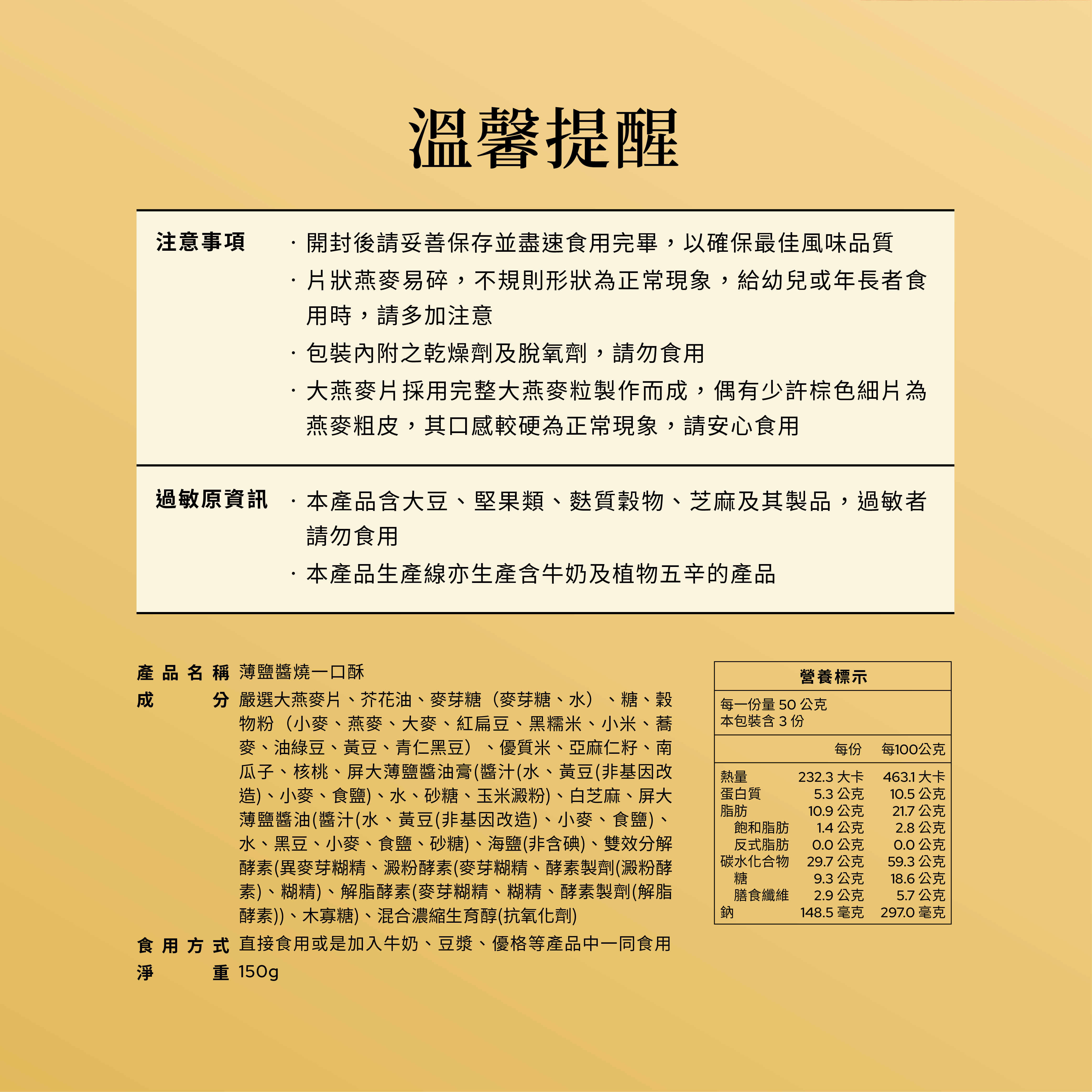 1.本產品含大豆、堅果類、麩質穀物、芝麻及其製品,過敏者請勿食用。